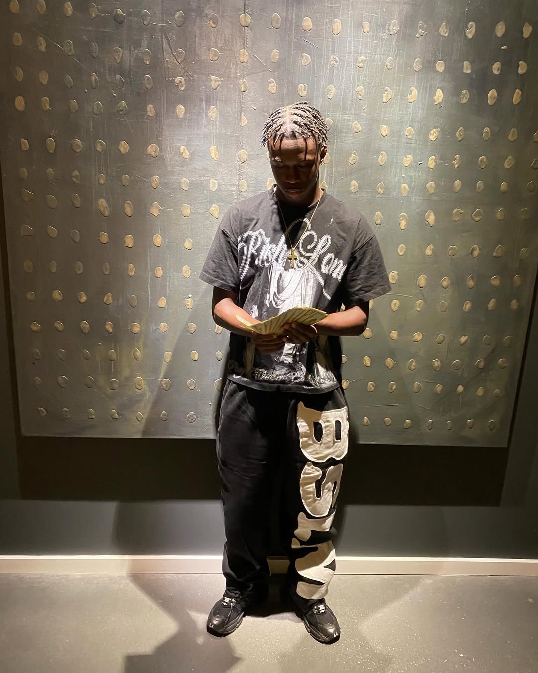 400 GSM heavyweight cotton with distressed embroidered patched logos, distressed cotton laces, and a faded stone-wash finish. Wide leg openings.
